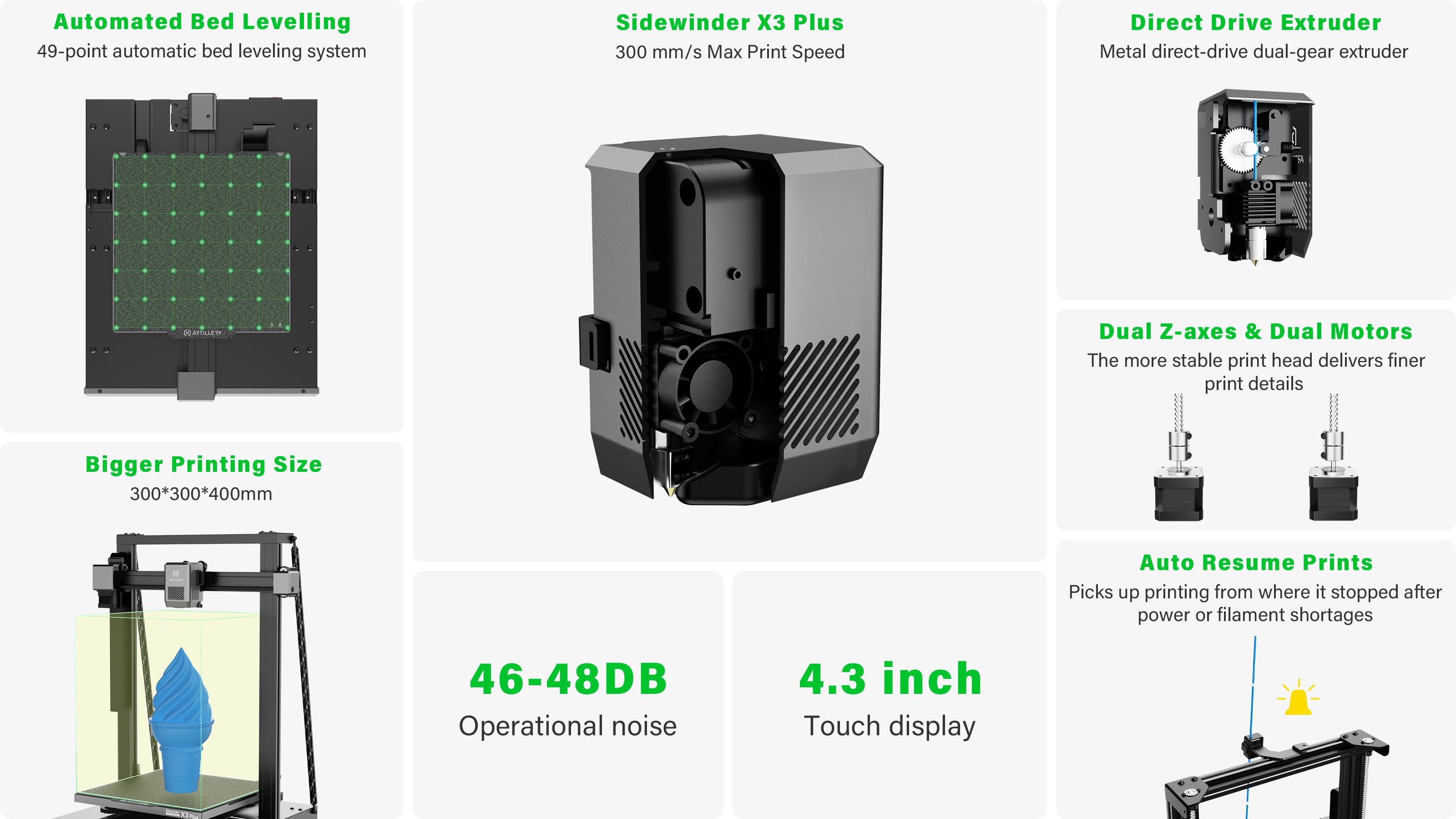 With an impressive 300×300×400 mm build area, the Sidewinder X3 Plus allows you to tackle large and complex projects effortlessly.
